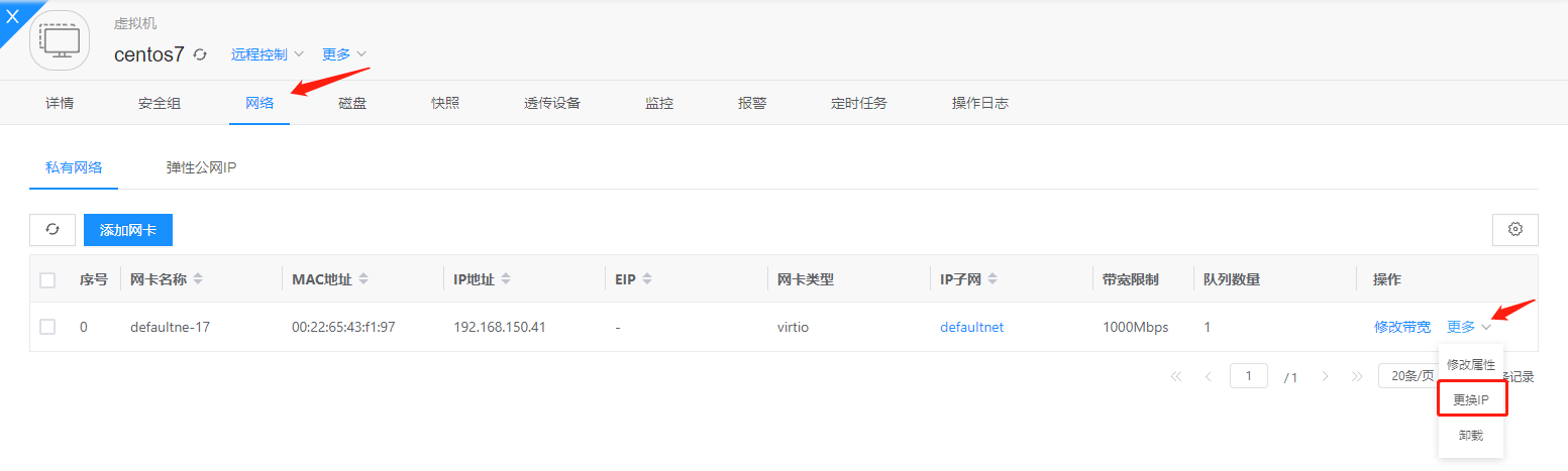 在虚拟机管理页面选择 网络——更多——更换IP 修改虚拟机的 IP 地址