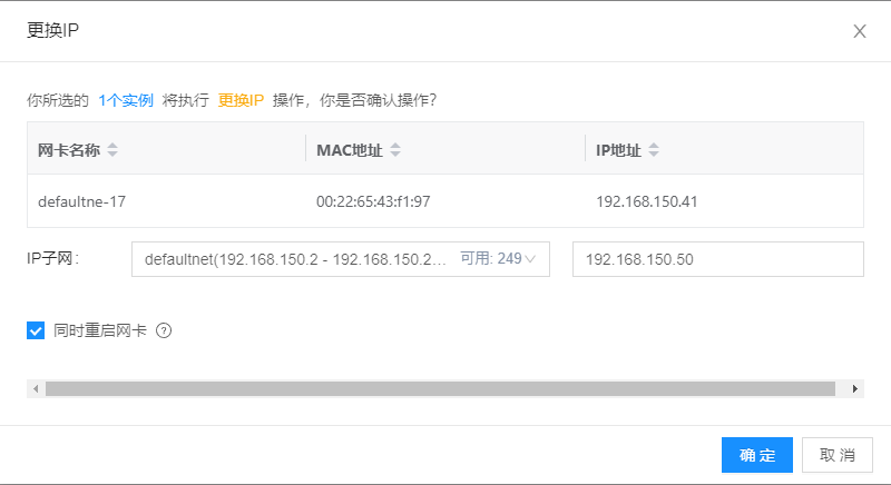 指定需要修改的 IP 地址,这里需要指定子网内的 IP 地址,因为要在运行状态下修改虚拟机的 IP ,需要勾选重启网卡按钮(默认勾选)